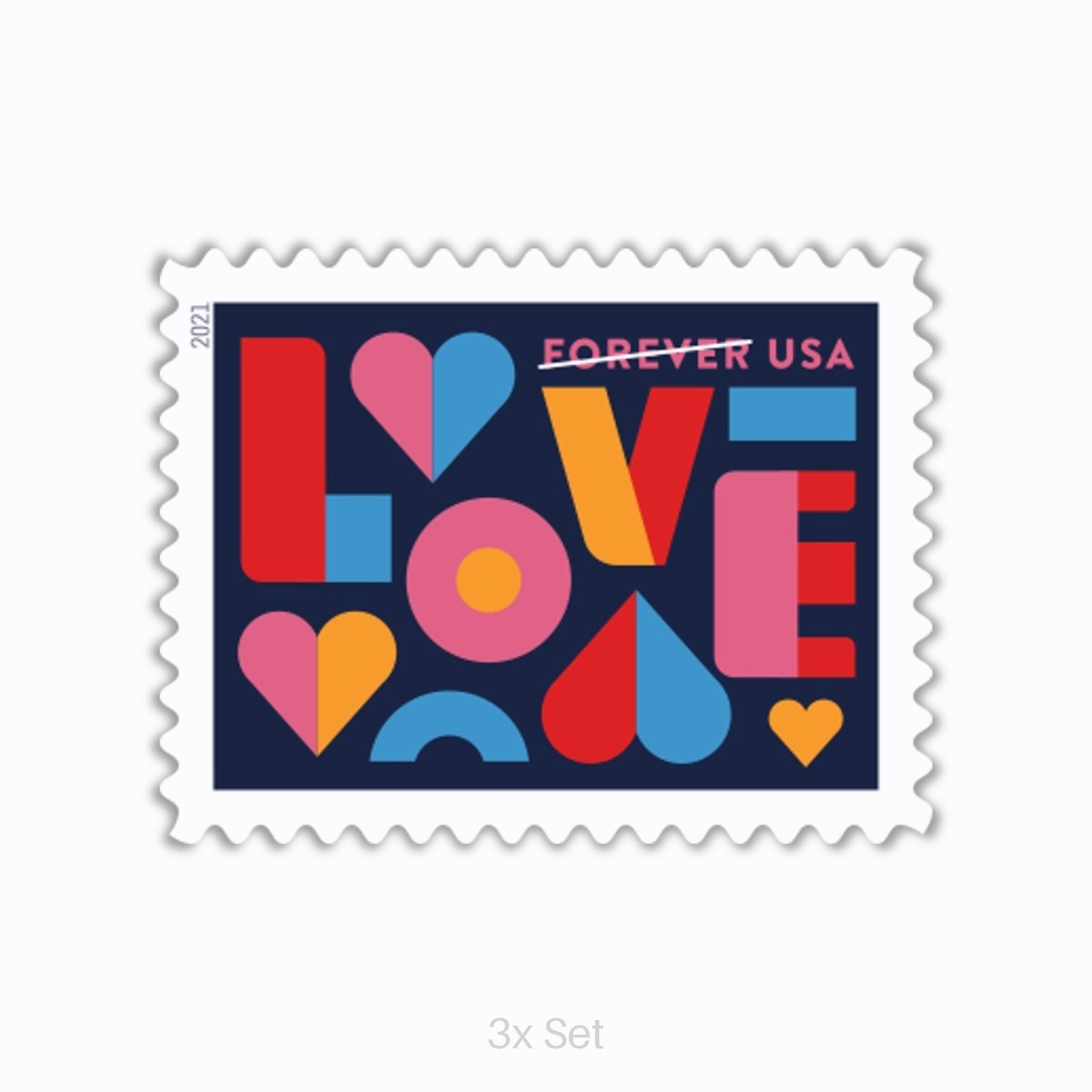 The 2021 Love stamp brings a fresh, contemporary voice to the historic Love Series. Instead of traditional florals or hearts, this issue embraces modern digital typography to express affection in a bold, graphic way.