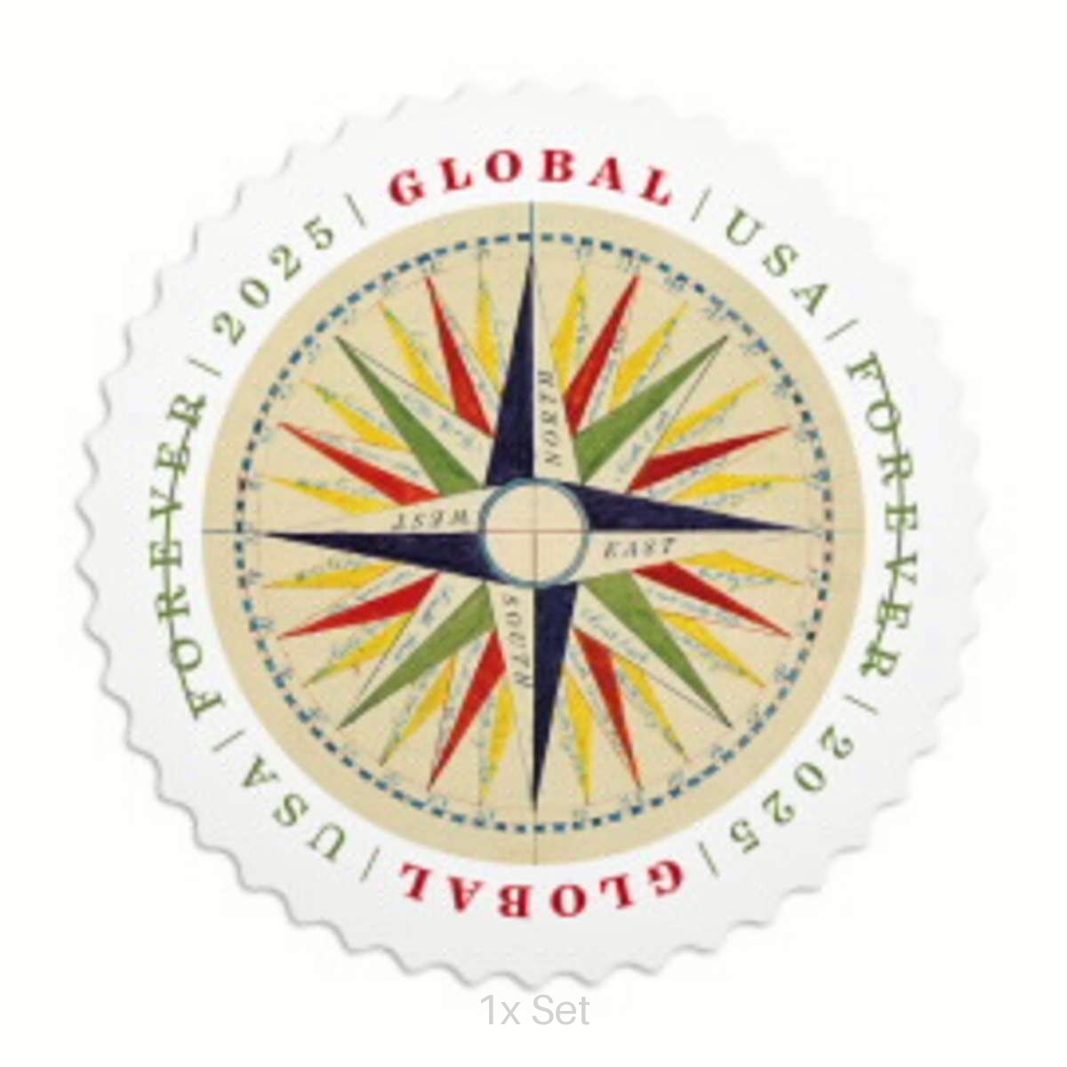 The Global: 1794 Compass Rose Forever® stamps are 100% genuine USPS postage issued in a self-adhesive pane of 10 and valid for mailing a one-ounce letter to any country where First-Class Mail International® service is offered. These unused, mint condition stamps feature a colorful 32-point compass rose drawn in 1794 by Lucia Wadsworth, a young student whose work is preserved in the Collections of the Maine Historical Society. Designed for international postal use, the 1794 Compass Rose stamps combine functional global postage with historical cartographic imagery.