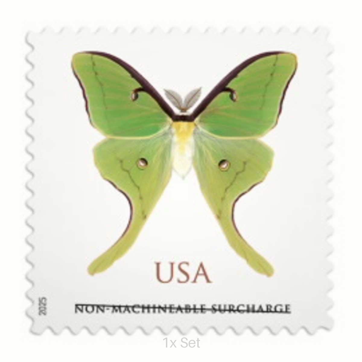 The Luna Moth non-machinable stamps are intended for use on mailpieces that do not meet USPS automated sorting specifications due to shape, size, or rigidity. These stamps are ideal for cards or envelopes that require manual handling, ensuring that postage meets USPS mailing requirements.