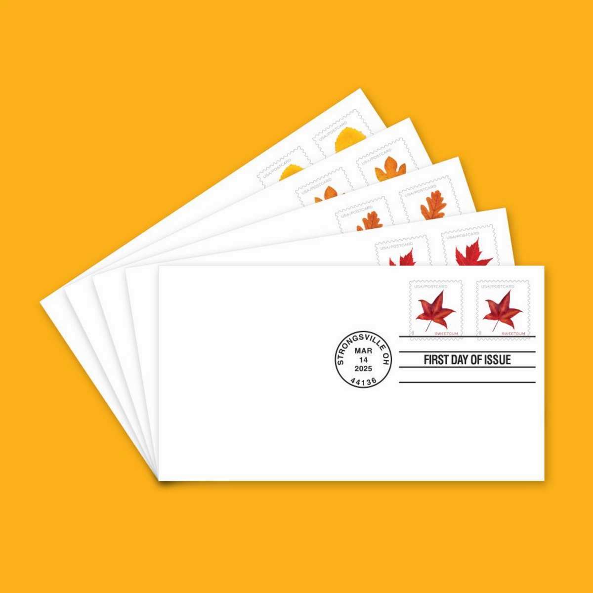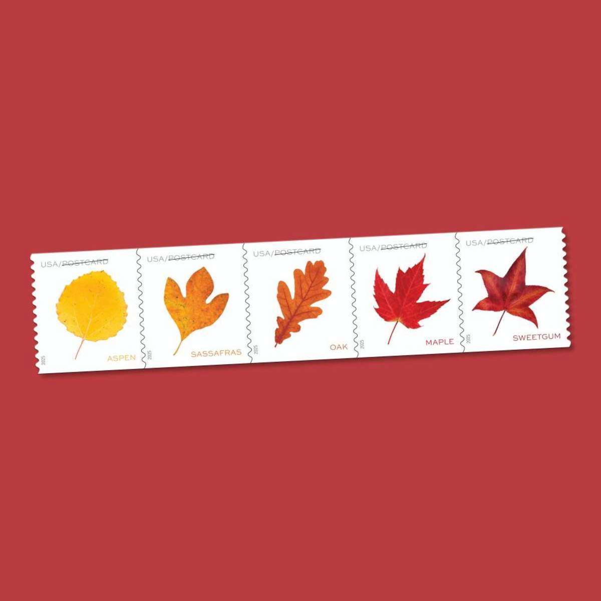 The Vibrant Leaves postcard stamps are 100% genuine USPS postage issued at the postcard rate and valid for mailing postcards domestically. These unused, mint condition stamps feature photographic images of leaves from five different tree species in autumnal hues, capturing the richness of seasonal color. Designed specifically for postcard use, the Vibrant Leaves stamps bring vivid natural imagery to personal and leisure mail throughout the year.